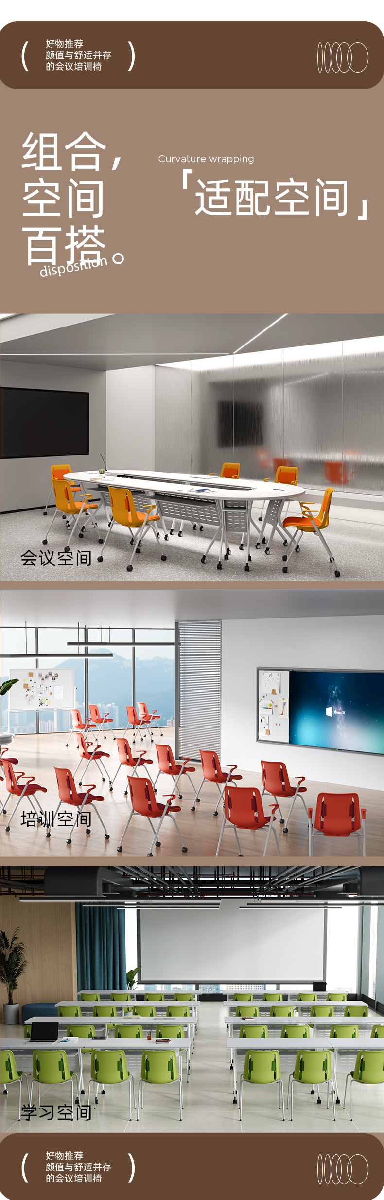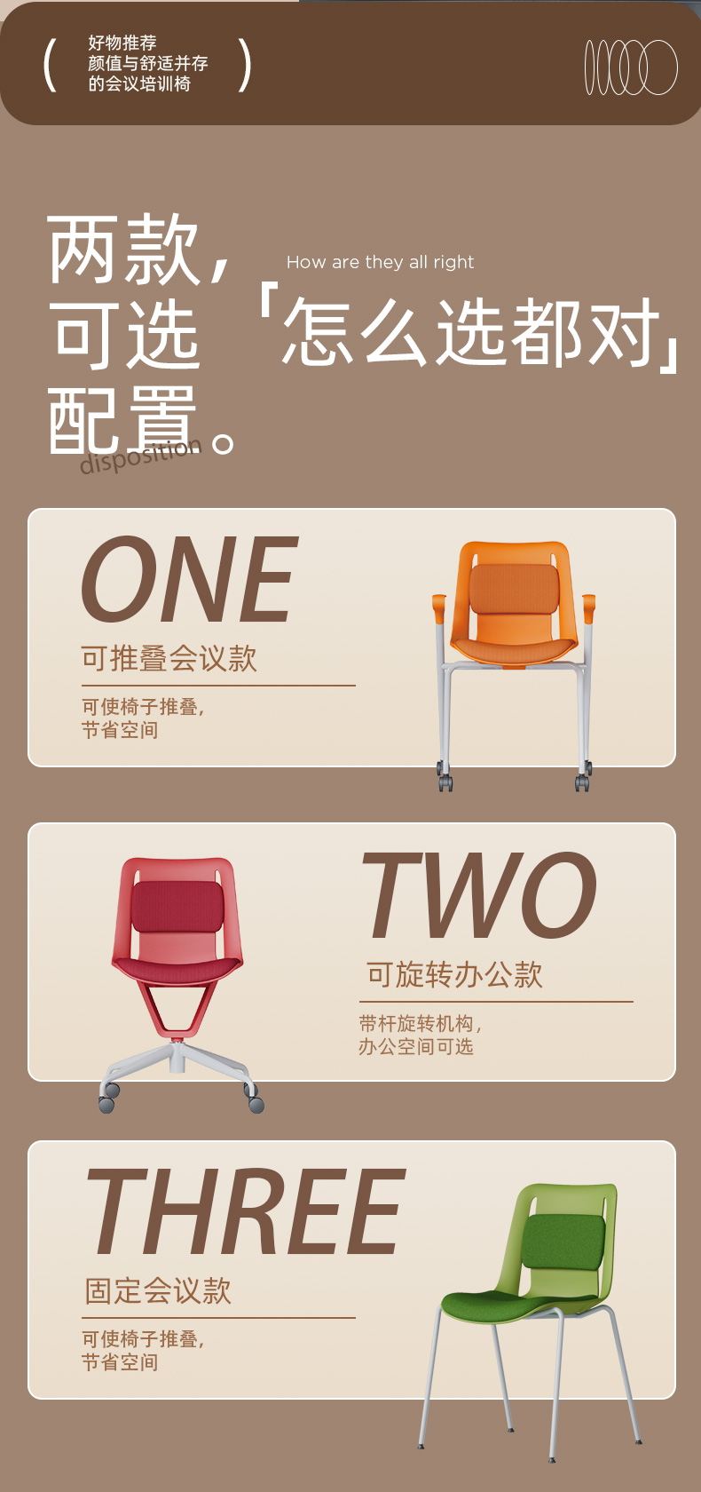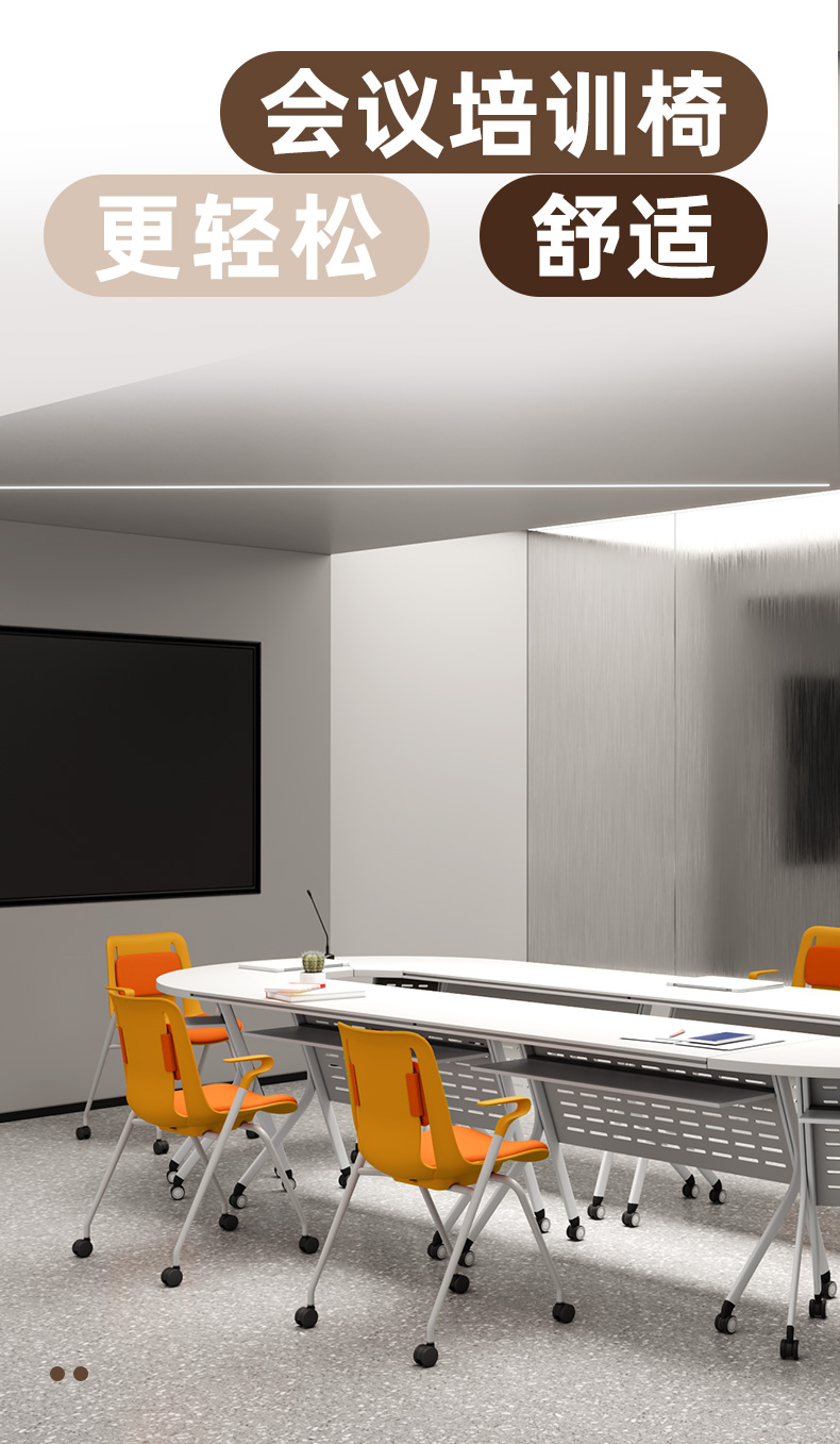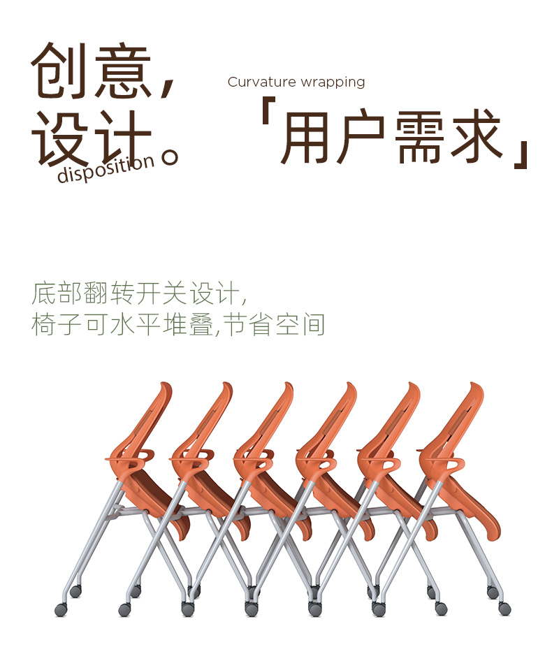 底部翻转开关设计 , 椅子可水平堆叠 , 节省空间。