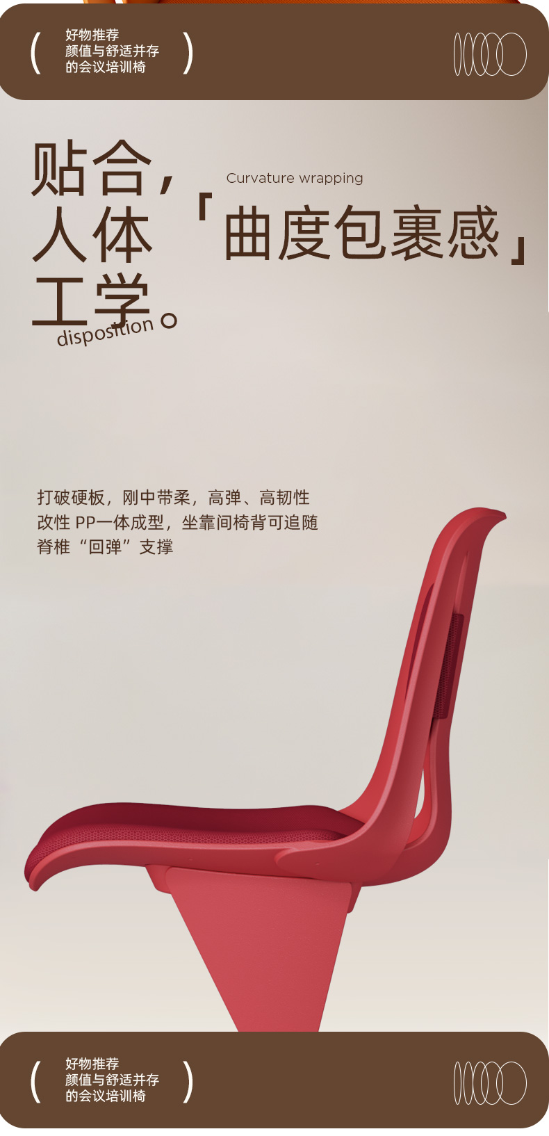 打破硬板,刚中带柔,高弹、高韧性改性 PP 一体成型,坐靠间椅背可追随脊椎“回弹”支撑。